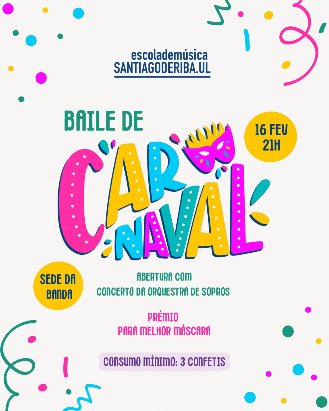Na segunda-feira, dia 16 de fevereiro, a Banda de Música de Santiago de Riba-Ul convida para um Baile de Carnaval na sua sede. O evento arranca às 21h com um concerto da Orquestra de Sopros. Prepare a sua melhor máscara, pois o vencedor do concurso de disfarces será premiado.