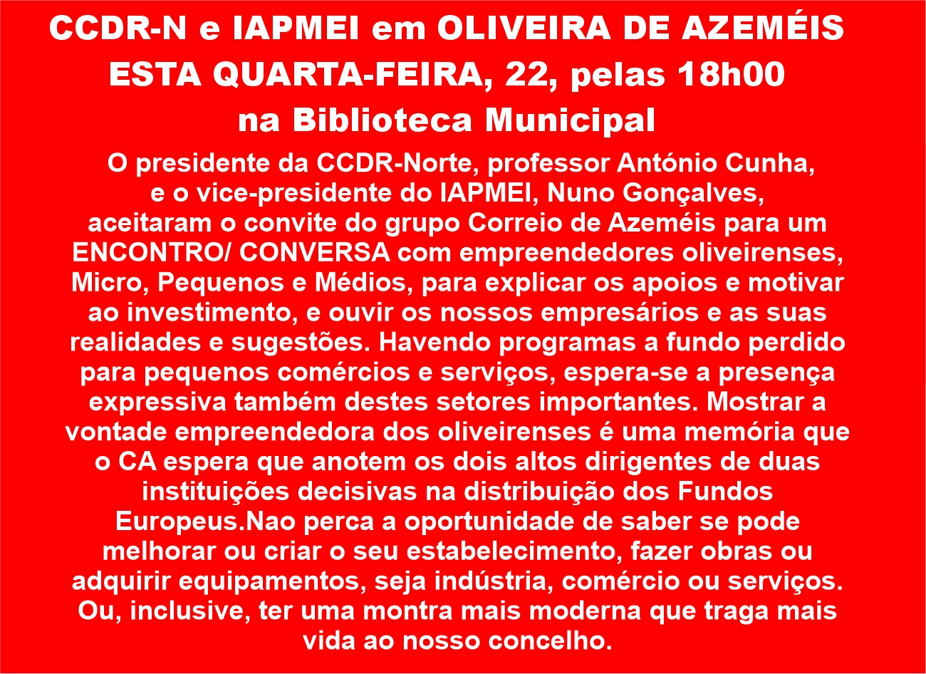 CCDR-N e IAPMEI em OLIVEIRA DE AZEMÉIS ESTA QUARTA-FEIRA, 22, pelas 18h00 na Biblioteca Municipal